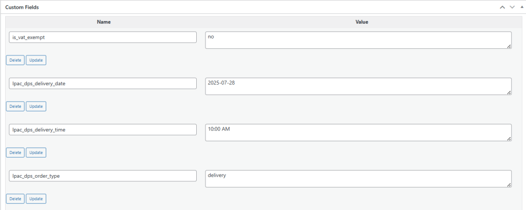 holds the scheduled delivery date chosen by the customer. This meta key has its value set to 2025-07-28